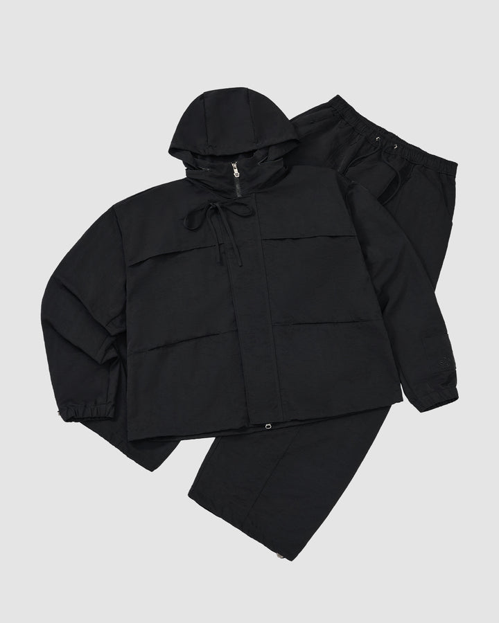 A flat lay of Sundae School's BLACK HANBOK BALLOON TRACK PANTS and a black hooded jacket with front pockets, both displayed on a light gray background.