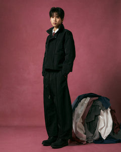 A person wearing Sundae School’s BLACK HANBOK BALLOON TRACK PANTS stands on a pink background next to draped, multicolored fabric, looking at the camera with a neutral expression.