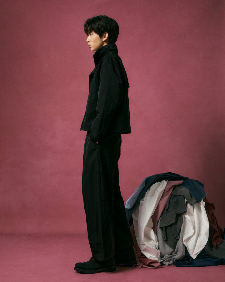 A person wearing Sundae School’s BLACK HANBOK BALLOON TRACK PANTS stands in profile against a pink backdrop, hands in pockets, beside a large pile of colorful fabrics on the floor.