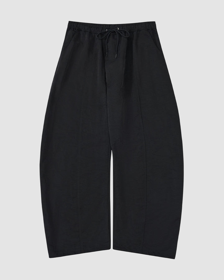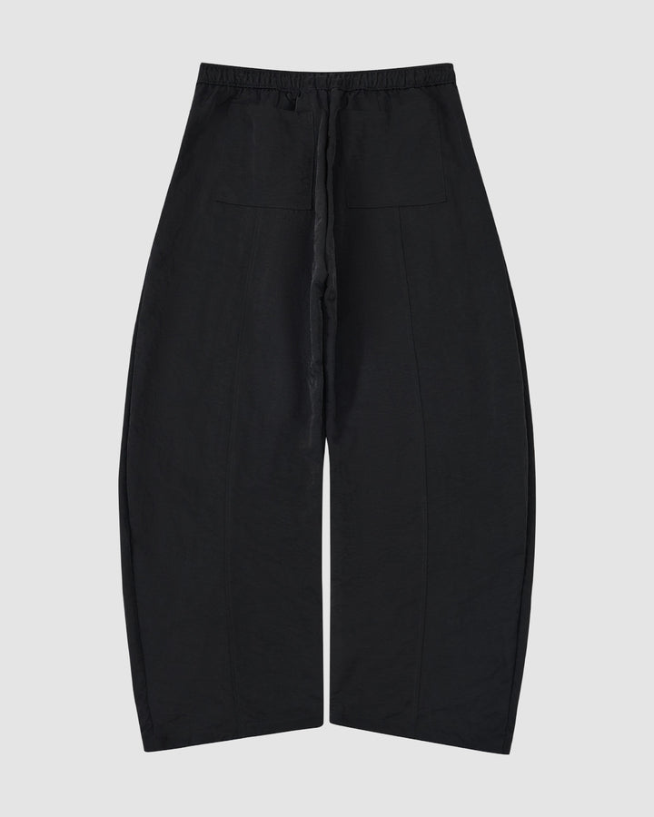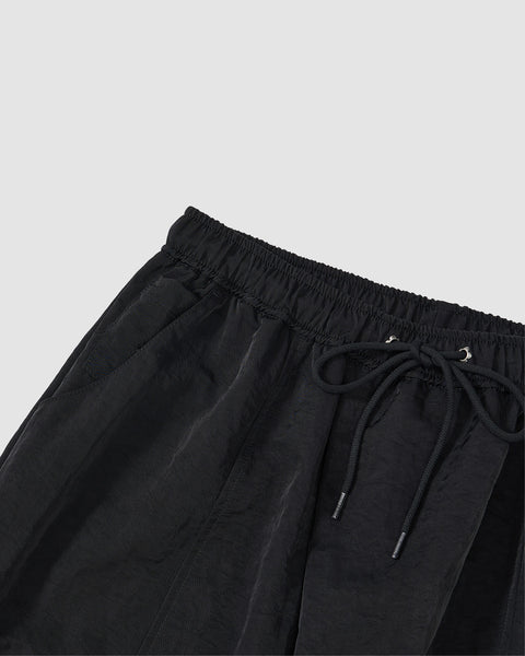 The BLACK HANBOK BALLOON TRACK PANTS by Sundae School feature a wide-leg fit, drawstring waist, vertical seams, and technical nylon fabric for windproof and water-resistant performance.