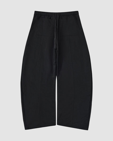 Close-up of Sundae School's BLACK HANBOK BALLOON TRACK PANTS, showcasing an elastic waistband, visible drawstring, and side pocket details with a curved barrel silhouette against a light gray background.