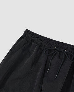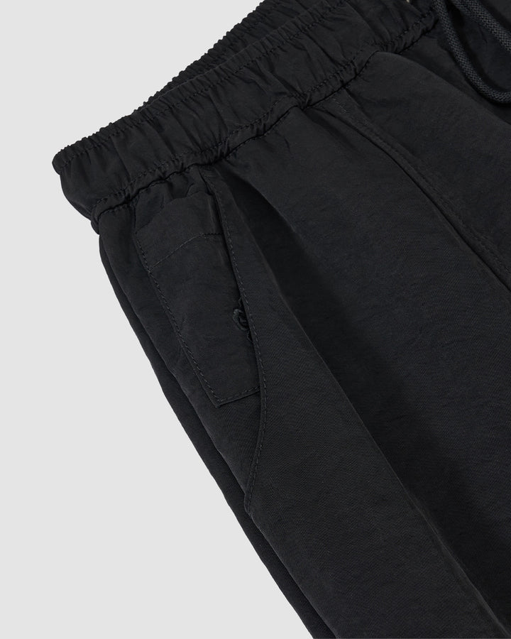 Close-up of Sundae School’s BLACK HANBOK BALLOON TRACK PANTS in technical nylon, featuring an elastic waistband and side pockets, displayed on a light gray background.