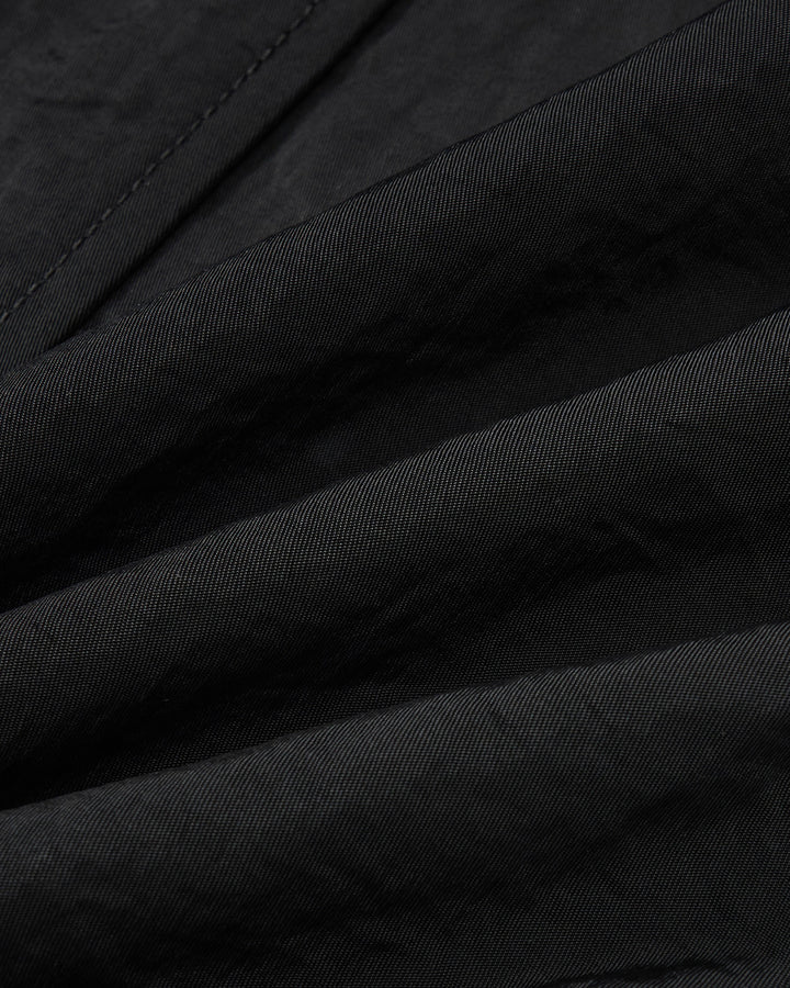 Close-up of Sundae School’s BLACK HANBOK BALLOON TRACK PANTS fabric, showing the fine weave, visible stitching, and diagonal creases that highlight the windproof, water-resistant technical nylon’s premium quality and detailed craftsmanship.