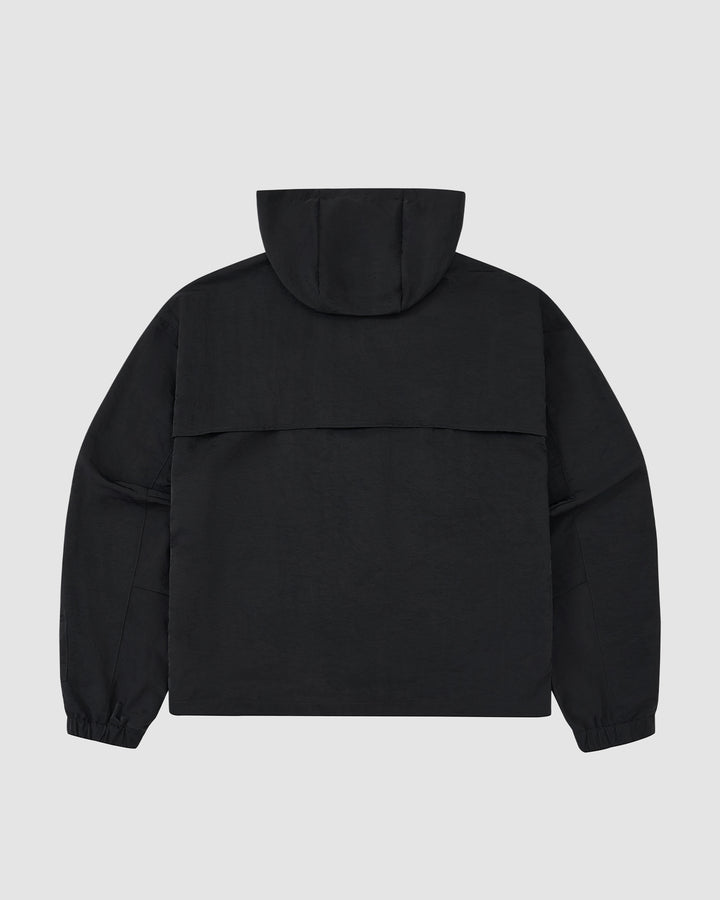 The BLACK HANBOK TRACK JACKET by Sundae School is a lightweight nylon, hooded jacket with long sleeves, elastic cuffs, and a horizontal flap on the upper back. Shown from the back against a light gray background.