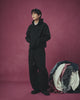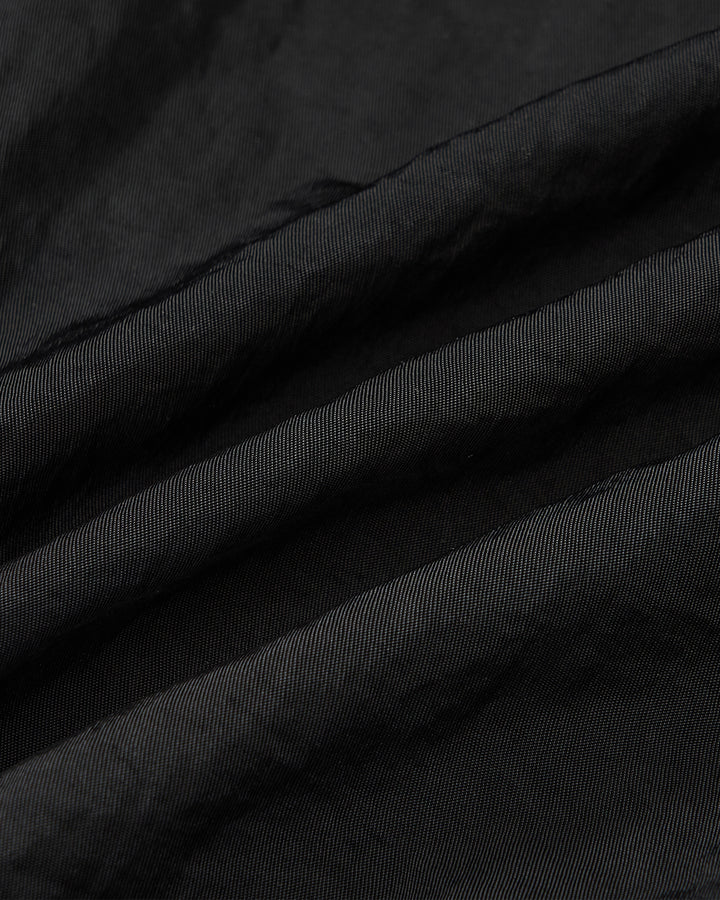 A close-up of Sundae School’s BLACK HANBOK TRACK JACKET highlights its fine, diagonal ribbing and soft folds, showcasing the textured fabric and subtle sheen.