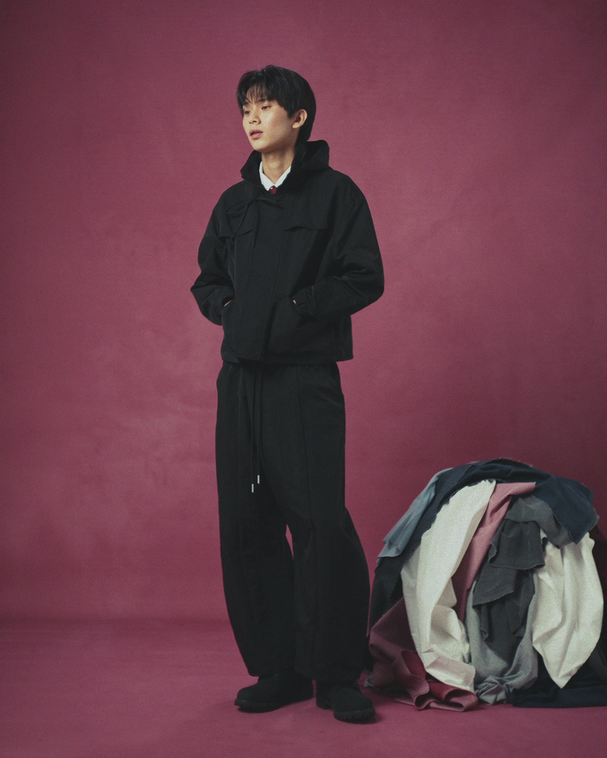 A person wearing Sundae School’s BLACK HANBOK BALLOON TRACK PANTS stands in profile against a pink backdrop, hands in pockets, beside a large pile of colorful fabrics on the floor.
