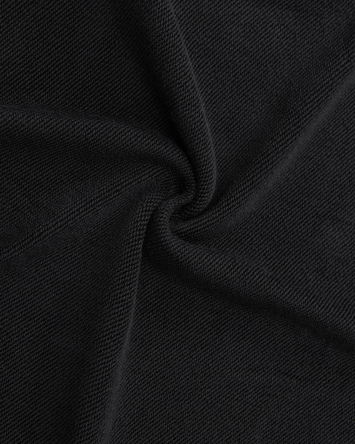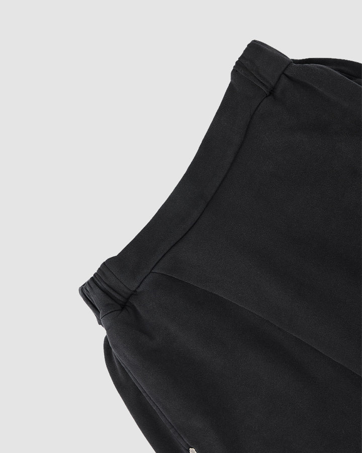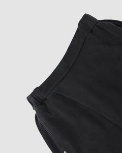 Close-up of the FADE BLACK WRAP SWEATBAJI by Sundae School, featuring black fabric with textured weave, gathered at the center to form soft, hanbok-inspired folds reminiscent of wide leg pants.