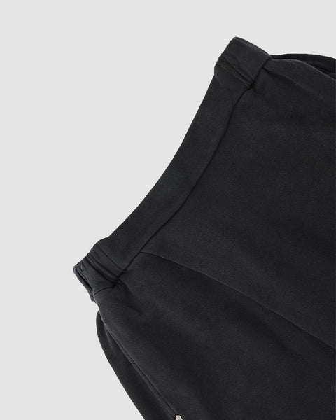 Close-up of Sundae School's FADE BLACK WRAP SWEATBAJI: wide-leg black cotton sweatpants with elasticated cuffs and an adjustable drawstring with metallic toggle, laid flat on a light gray background.