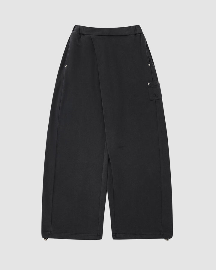 The FADE BLACK WRAP SWEATBAJI by Sundae School features a hanbok-inspired wide-leg design, overlapping front panel, side pockets, flap pocket on the right, and adjustable hem drawstrings, shown flat on a light gray background.