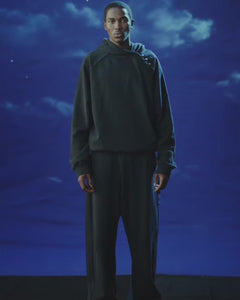 A man stands before a moon, wearing Sundae School’s FADE BLACK HANBOK HOODIE featuring an asymmetric hood closure and signature stash pocket.