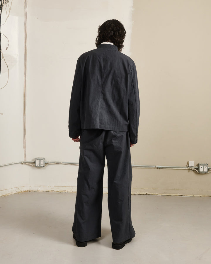 A person with long dark hair stands indoors against a plain wall, wearing Sundae School's CHARCOAL STAND COLLAR UNIFORM JACKET and wide-leg trousers in a cotton-nylon blend, over a white shirt. Exposed wires and outlets are visible on the walls.