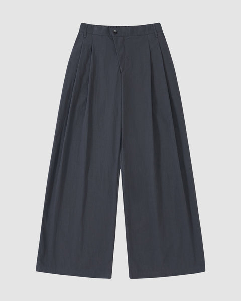 Sundae School CHARCOAL PLEATED UNIFORM SLACKS: wide-leg, high-waisted charcoal trousers with pleats and button closure, displayed flat on a light gray background.