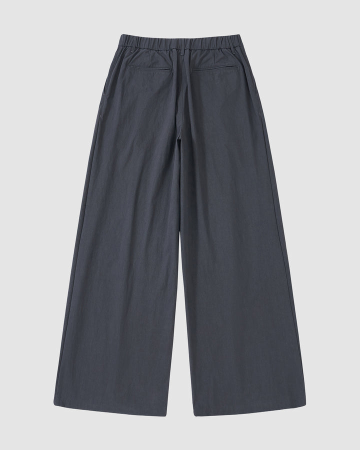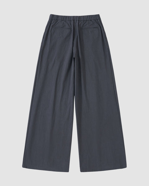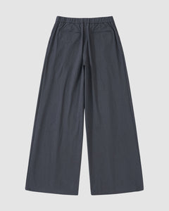The CHARCOAL PLEATED UNIFORM SLACKS by Sundae School feature a wide-leg fit, elastic waistband, and two back pockets, shown laid flat on a light background.