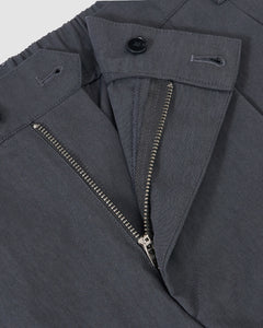 Close-up of Sundae School’s CHARCOAL PLEATED UNIFORM SLACKS, inspired by classic Korean school uniforms, featuring an open zipper fly and two buttons at the waistband.