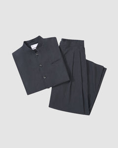 The CHARCOAL STAND COLLAR UNIFORM JACKET by Sundae School, made from a cotton nylon blend with buttons and a chest pocket, is neatly displayed with matching pleated trousers on a light gray background.