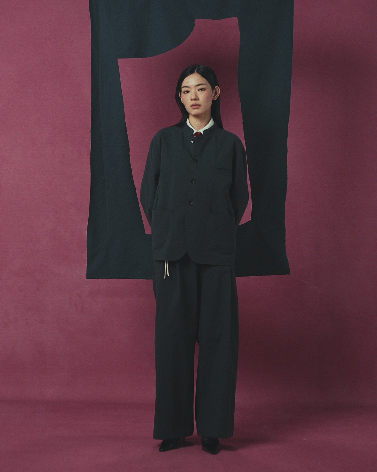 A young person with long dark hair faces forward, wearing Sundae School CHARCOAL PLEATED UNIFORM SLACKS inspired by Korean school uniforms and a dark grey mandarin collar jacket.