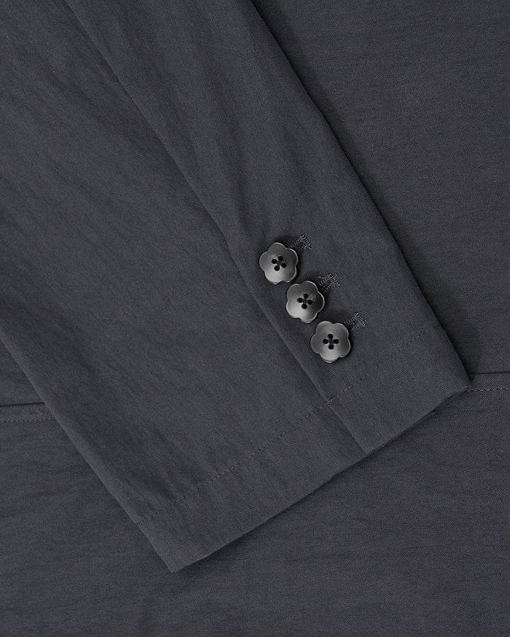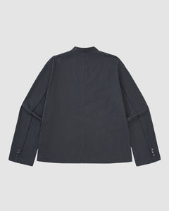 Back view of Sundae School's CHARCOAL STAND COLLAR UNIFORM JACKET, a wrinkle-resistant, cotton-nylon blend blazer with buttoned cuffs, stand collar, center seam, and long sleeves, shown on a plain light background.