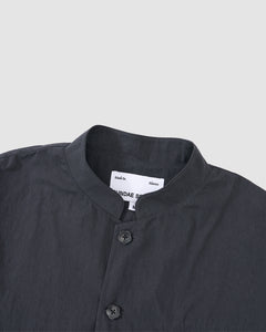A close-up of the Sundae School CHARCOAL STAND COLLAR UNIFORM JACKET, made from a soft cotton-nylon blend with two buttons, set against a light grey background. A white label is visible inside the collar.