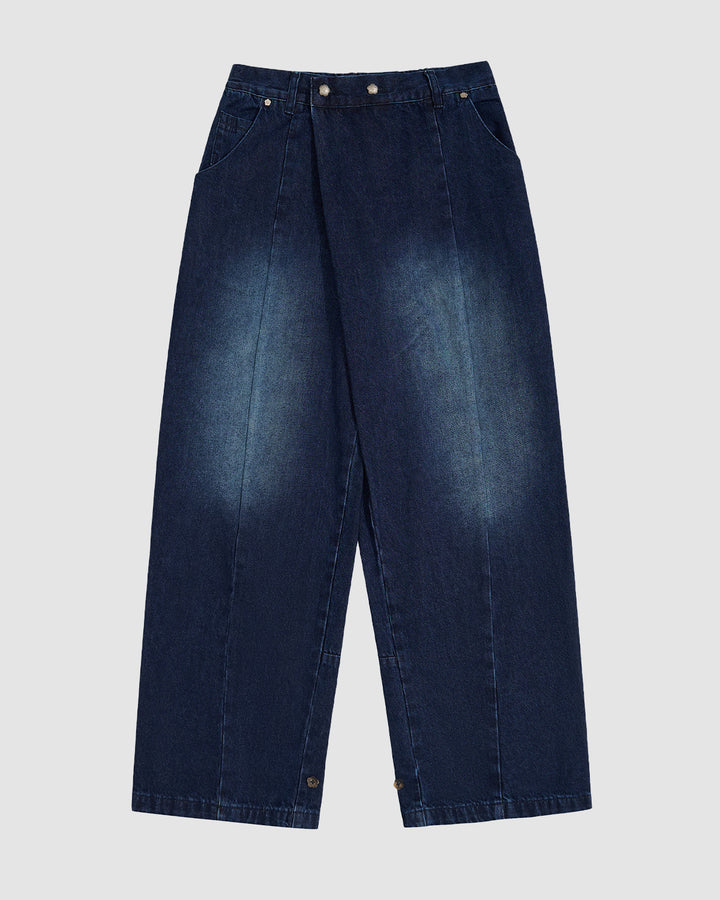 Close-up detail of indigo fade hanbok denim waistband showing silver flower-shaped snap buttons and asymmetric front closure design, highlighting custom hardware and button placement