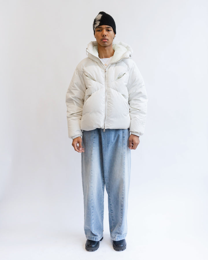 A person stands against a plain white background wearing the Sundae School IVORY LIME ORIGAMI PUFFER, wide-leg light blue jeans, black shoes, and a black beanie with a white patch.