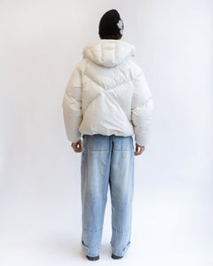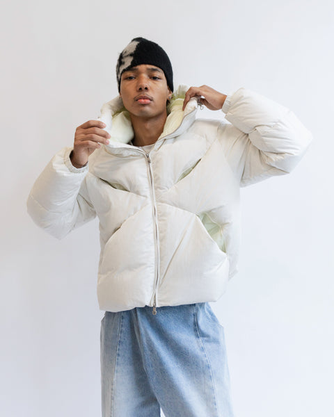 A person stands against a gray wall wearing the Sundae School IVORY LIME ORIGAMI PUFFER, a white hooded puffer jacket with a quilted pattern and silver zipper, hands in pockets, face partially out of frame.