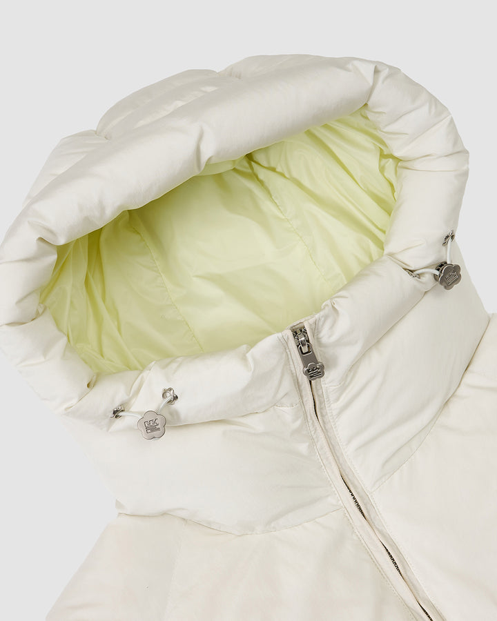 Close-up of the Sundae School IVORY LIME ORIGAMI PUFFER, a white puffer jacket with a hood lined in light yellow, front zipper, and metallic drawstring stoppers.