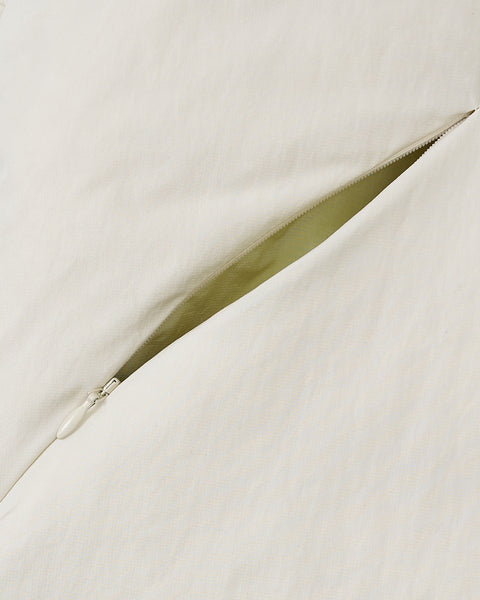 Close-up of the Sundae School IVORY LIME ORIGAMI PUFFER, a light-colored, water-resistant jacket featuring water droplets on the surface and a partially unzipped metal zipper.