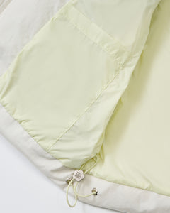 Close-up of the inside of the Sundae School IVORY LIME ORIGAMI PUFFER, featuring a pale yellow lining, interior pocket, and an adjustable drawstring with metal toggle at the hem.