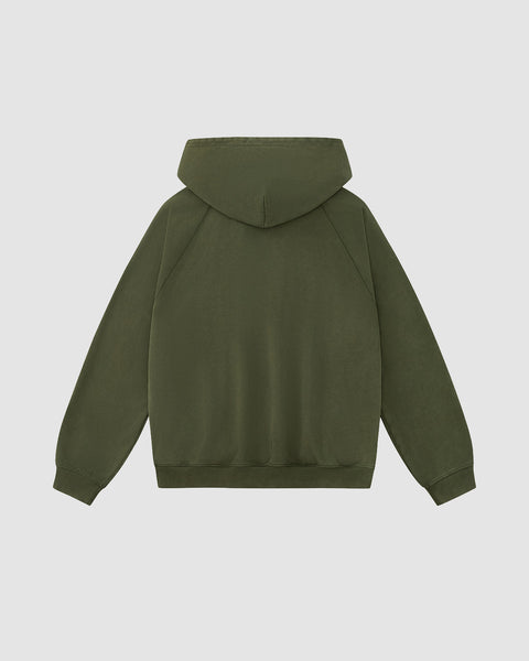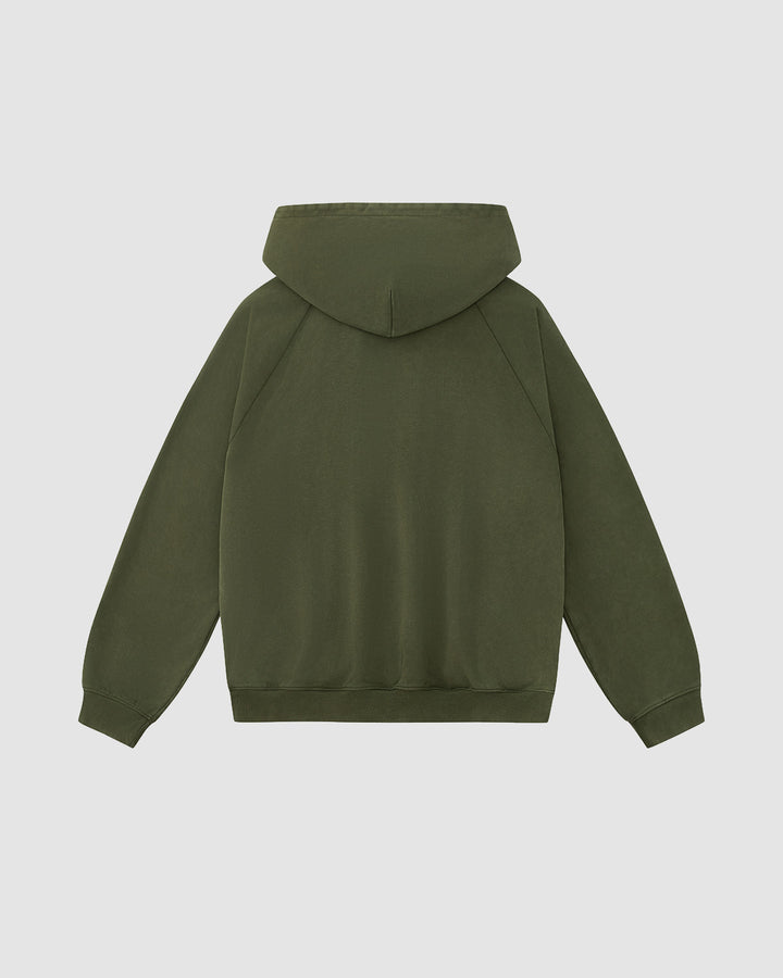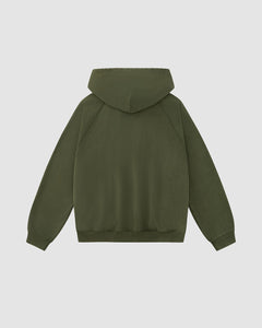 The Sundae School KHAKI HANBOK HOODIE is shown from the back on a light gray background. This olive green hoodie features long sleeves, a hood, ribbed cuffs and hem, and a signature stash pocket for convenience.