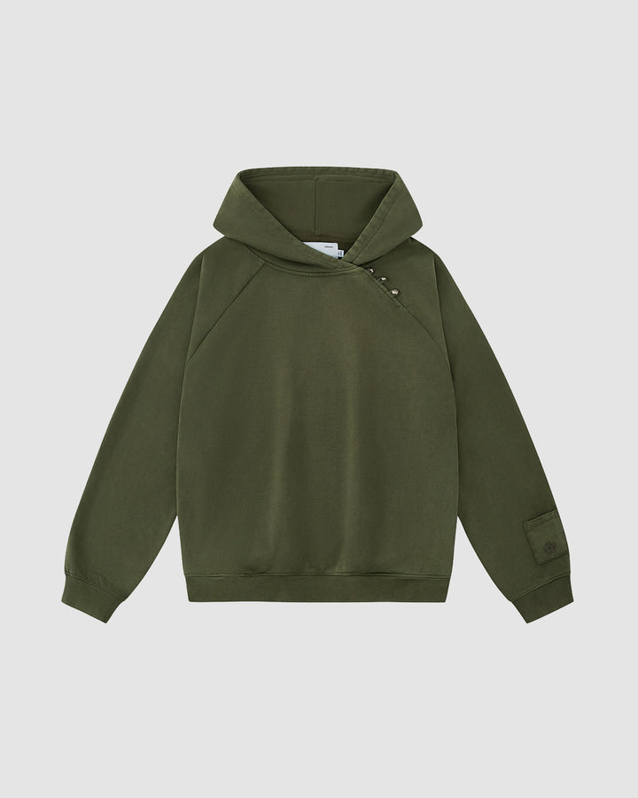 The Sundae School KHAKI HANBOK HOODIE features an olive green design with raglan sleeves, an asymmetrical button closure at the neckline, a patch on the left cuff, and a signature stash pocket, shown on a plain white background.