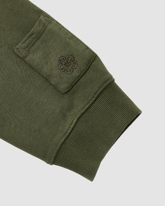 Close-up of the KHAKI HANBOK HOODIE by Sundae School, showing an olive green sleeve with a ribbed cuff and a stash pocket embroidered with a flower. The background is light gray.