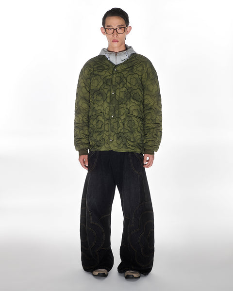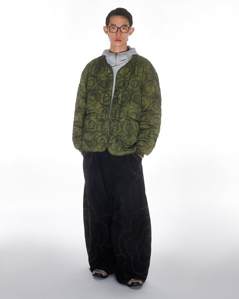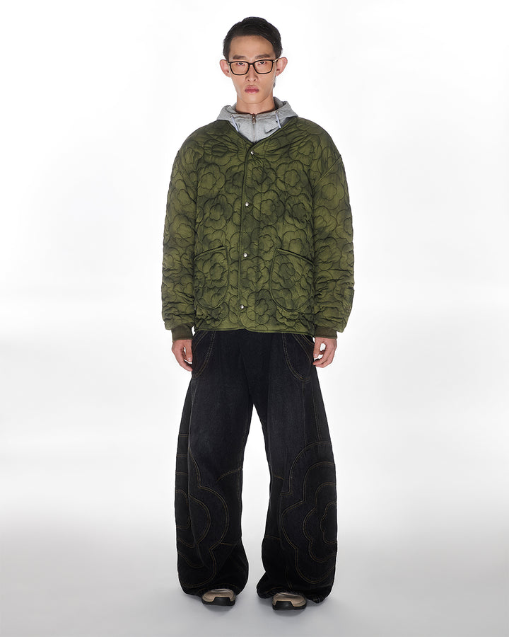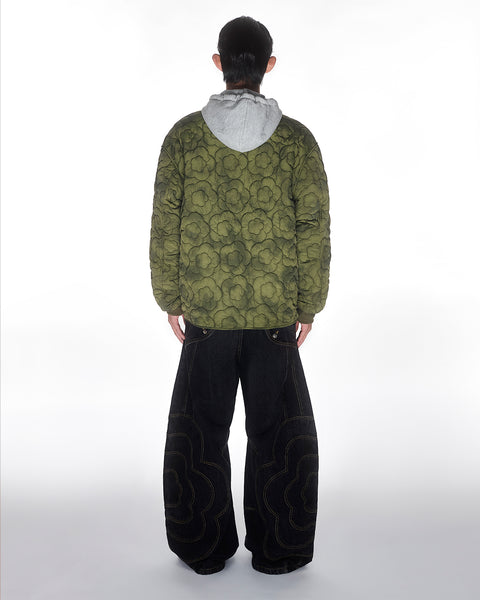 A person faces away, wearing the Sundae School MATCHA MOCHI QUILTED MILITARY LINER—a Korean military-inspired floral jacket over a gray hoodie and wide-leg black jeans. The plain white background highlights this transitional style.