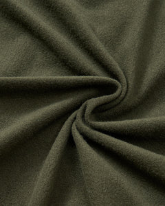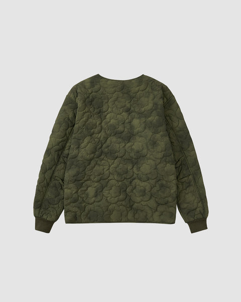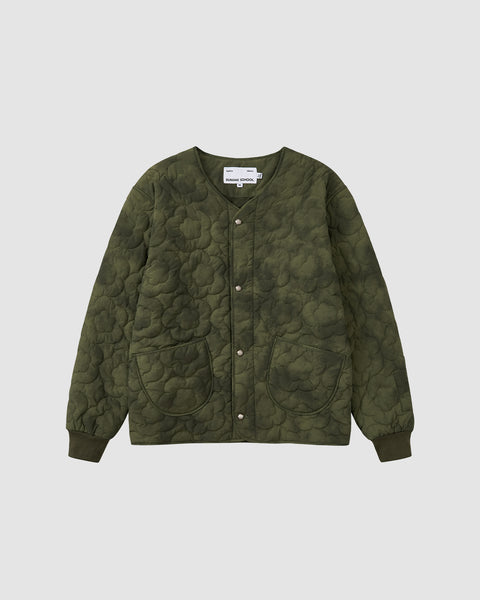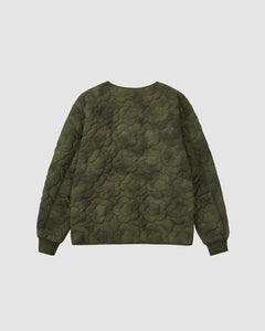 The MATCHA MOCHI QUILTED MILITARY LINER by Sundae School is an olive green, long-sleeve quilted sweatshirt with a textured floral pattern, shown from the back against a plain white background—ideal for transitional weather.