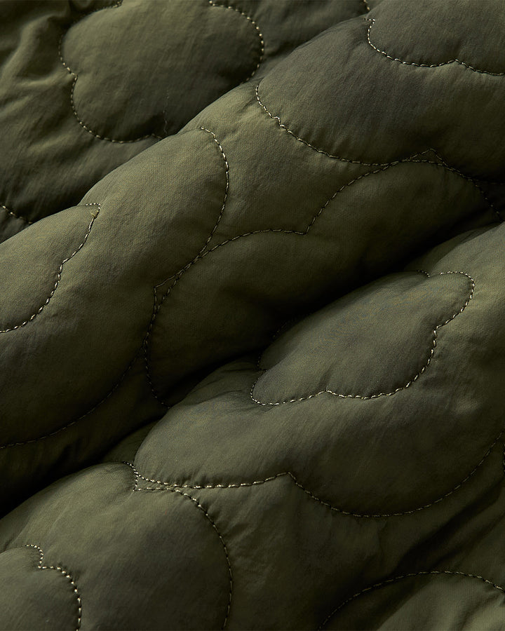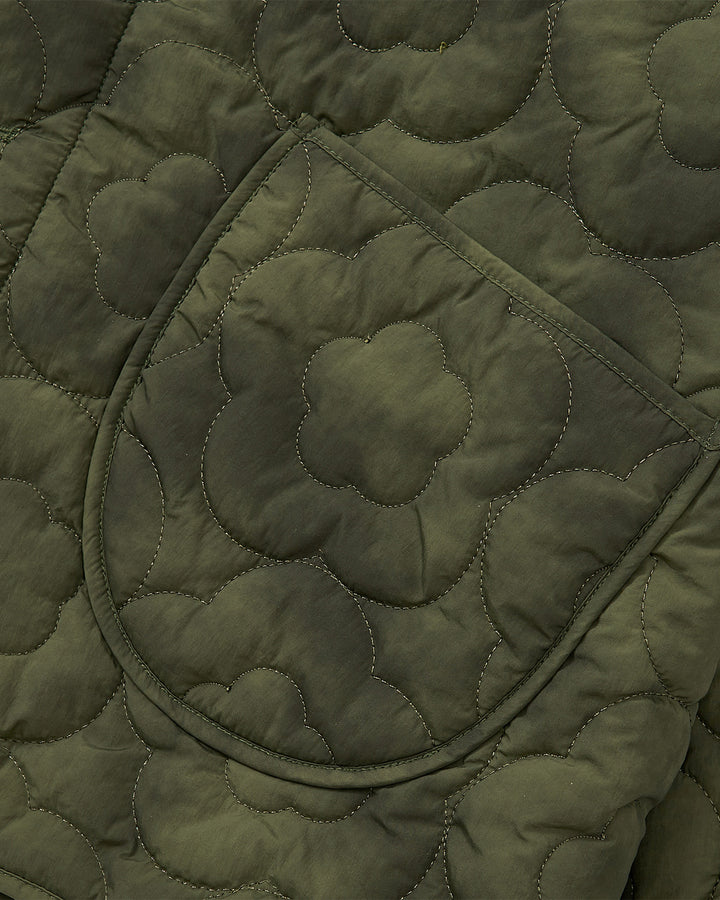 Close-up of olive green MATCHA MOCHI QUILTED MILITARY LINER by Sundae School, featuring a curved-edge pocket and floral-patterned stitching—ideal as a transitional weather layer inspired by classic Korean military jackets.