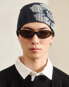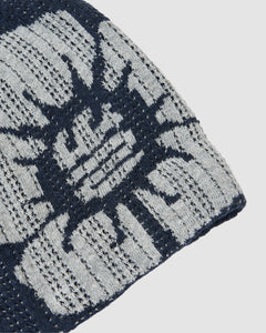 The NAVY DDUL KNIT BEANIE by Sundae School is a dark blue beanie with a large white flower on the side, made from breathable spring jersey for comfort and style.