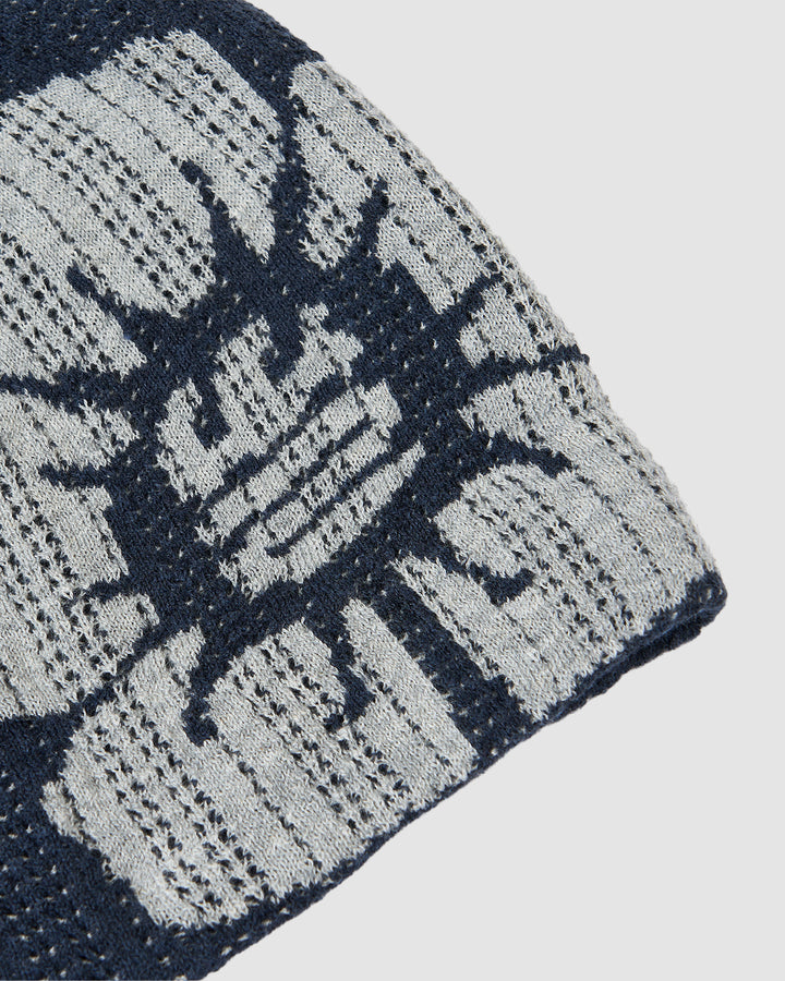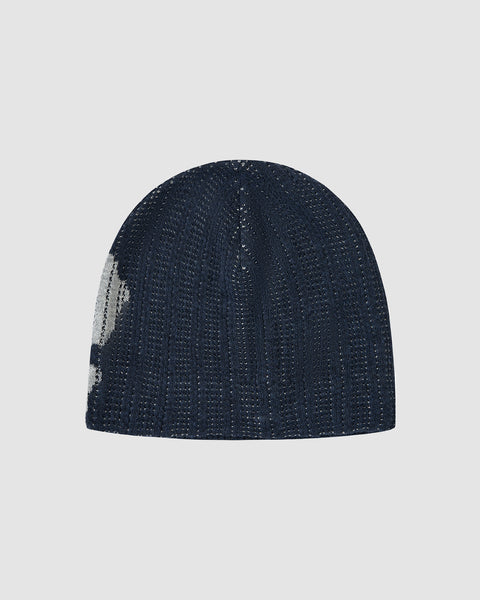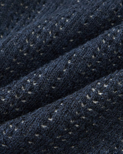 Close-up of the NAVY DDUL KNIT BEANIE by Sundae School, showcasing its dark blue cotton jacquard knit with a textured pattern and small white specks, highlighting the detailed stitches and fibers.