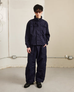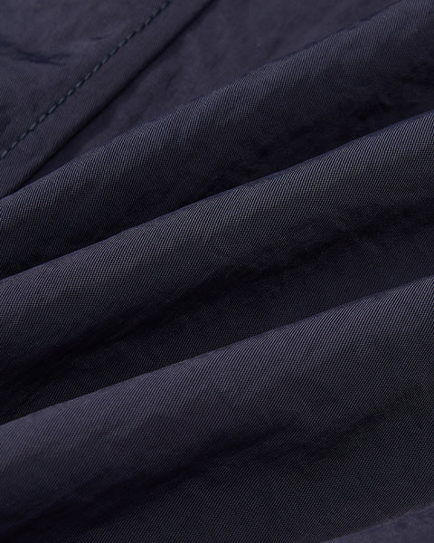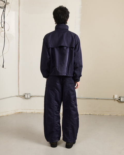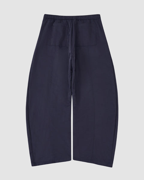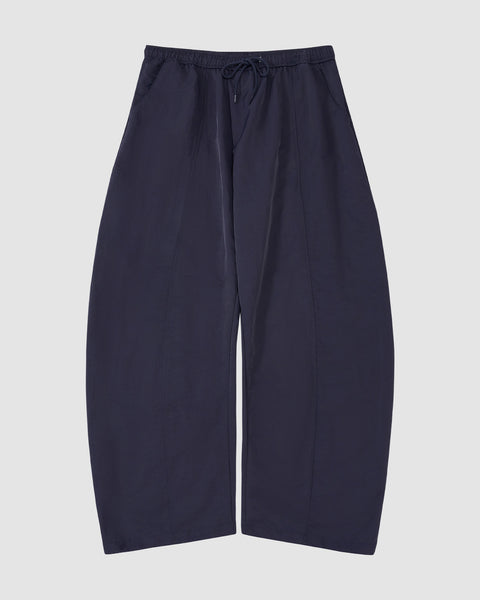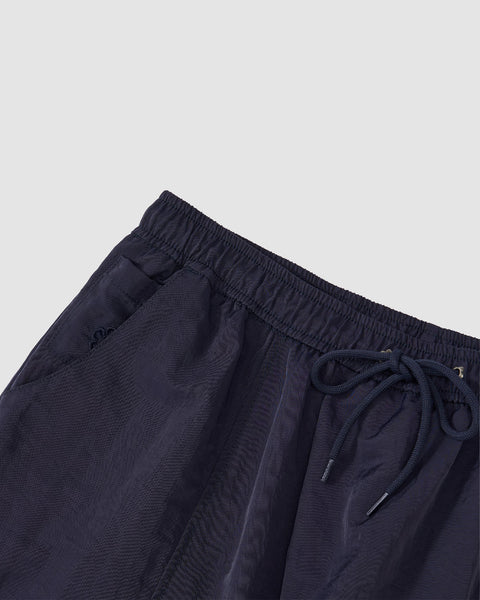 Sundae School NAVY HANBOK BALLOON TRACK PANTS in navy blue nylon with a loose fit, elastic waistband, front drawstring, adjustable hems, and two front patch pockets are shown laid flat on a light grey background.