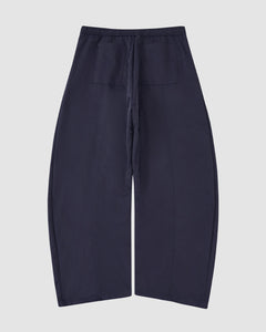 Close-up of Sundae School’s NAVY HANBOK BALLOON TRACK PANTS, showing dark, textured fabric with diagonal lines and folds that create depth and softness—evoking the unique curved barrel silhouette of these adjustable-hem pants.