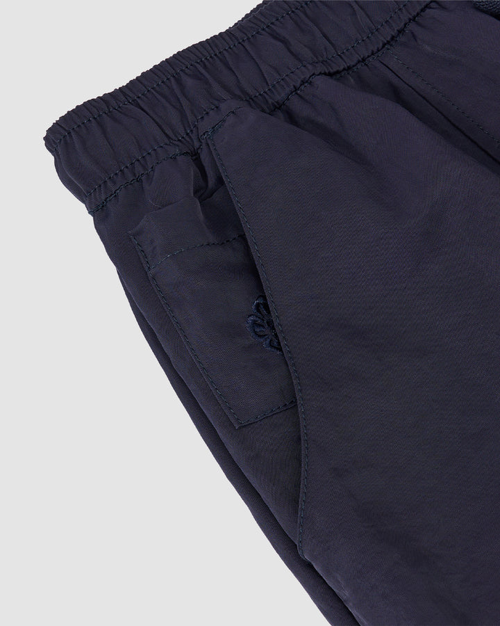 Close-up of Sundae School’s NAVY HANBOK BALLOON TRACK PANTS in navy nylon, featuring an elastic waistband, side pocket with detailed stitching, small embroidered logo near the pocket, and adjustable hems on a light grey background.