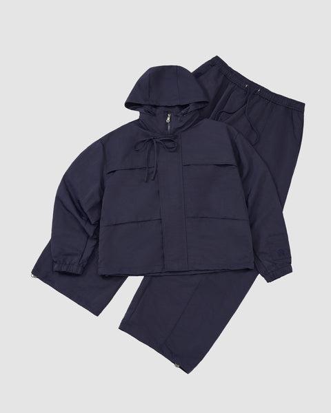 The NAVY HANBOK TRACK JACKET by Sundae School, featuring a hood, custom 떨 zipper pull, and front pockets, is paired with loose-fit elastic waist pants and laid flat on a light background.
