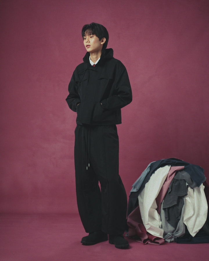Asymmetric tie and zipper closure inspired by the traditional Korean hanbok for silent luxury.