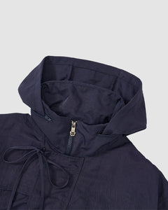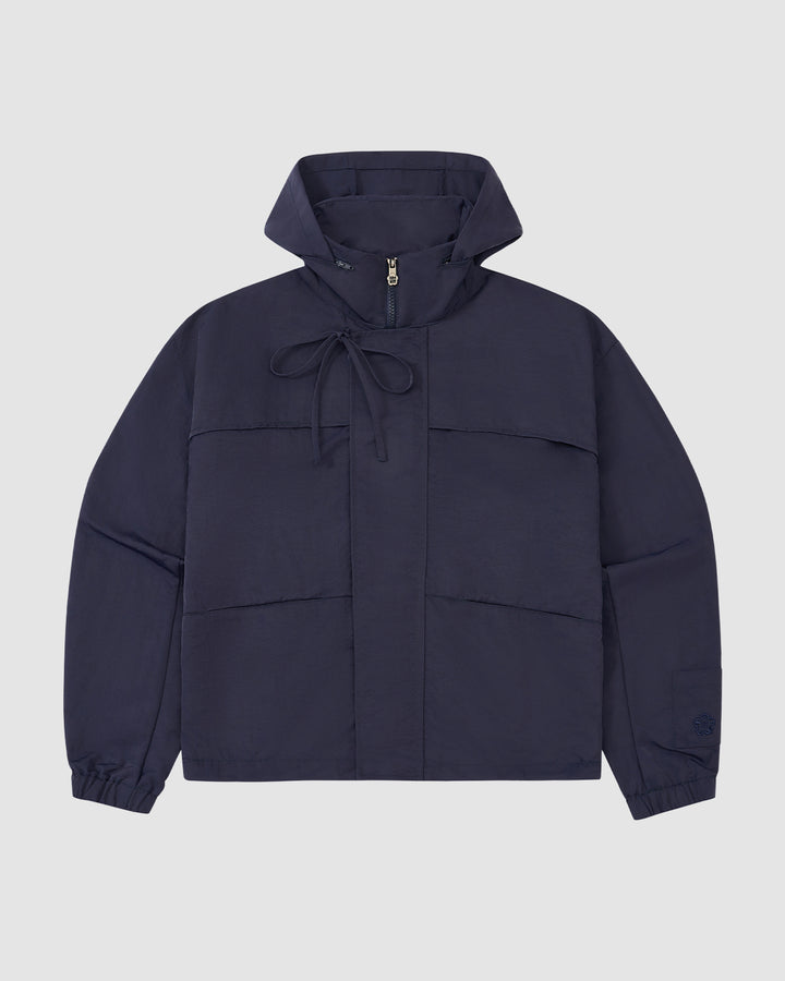 A close-up of the Sundae School NAVY HANBOK TRACK JACKET, made from lightweight nylon with a partial front zipper, custom 떨 zipper pull, and neckline drawstring, shown on a light gray background.