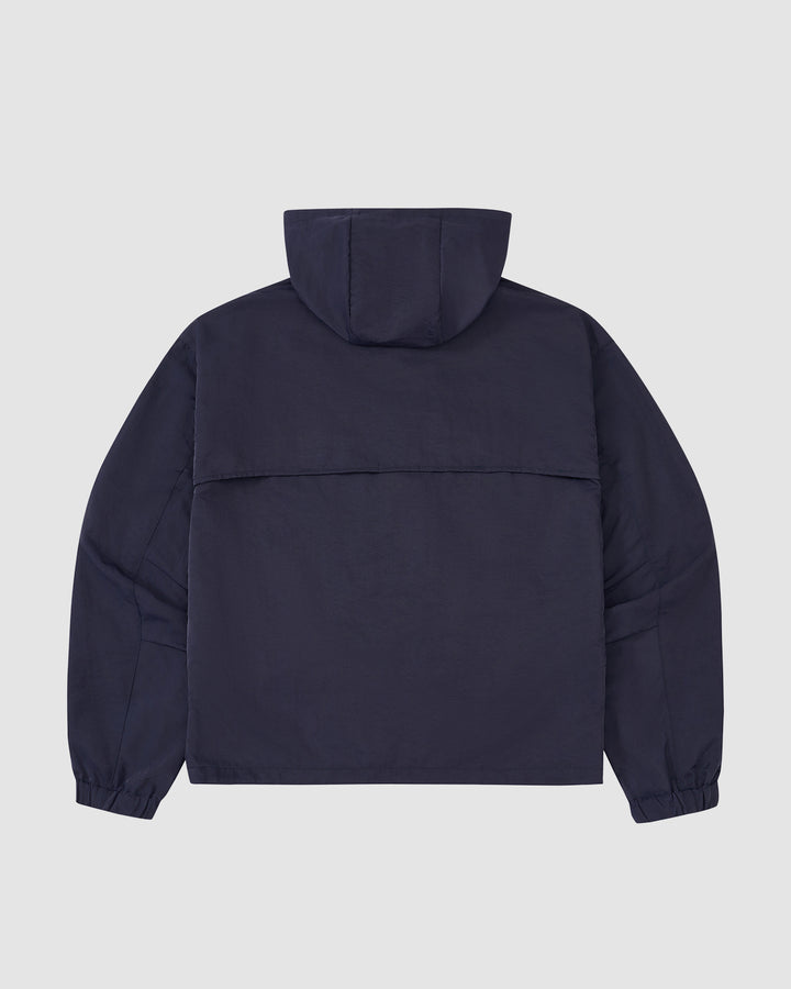 The Sundae School NAVY HANBOK TRACK JACKET is shown from the back, featuring long sleeves, elastic cuffs, a relaxed fit, and lightweight nylon construction with a minimalist design and no visible logos or embellishments.