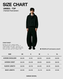 A person stands facing forward wearing the Sundae School NAVY HANBOK TRACK JACKET with wide-leg pants and a custom 떨 zipper pull. Size chart (XS–XL) lists measurements in inches. Model is 6'1
