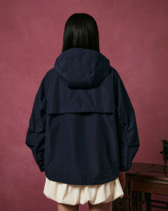 The NAVY JEOGORI TIE SHELL JACKET by Sundae School is a unisex technical outerwear piece in navy blue, featuring a water-resistant shell, elastic cuffs, long sleeves, and a relaxed fit. Shown from the back against a plain light background.