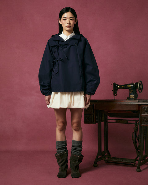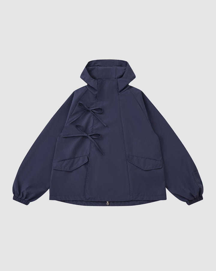 The Sundae School NAVY JEOGORI TIE SHELL JACKET features a water-resistant navy shell, two front pockets, elastic cuffs, and dual bow tie closures, shown against a plain light gray background.