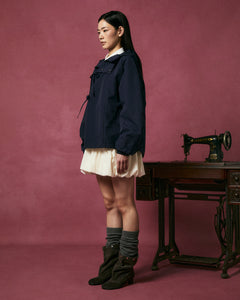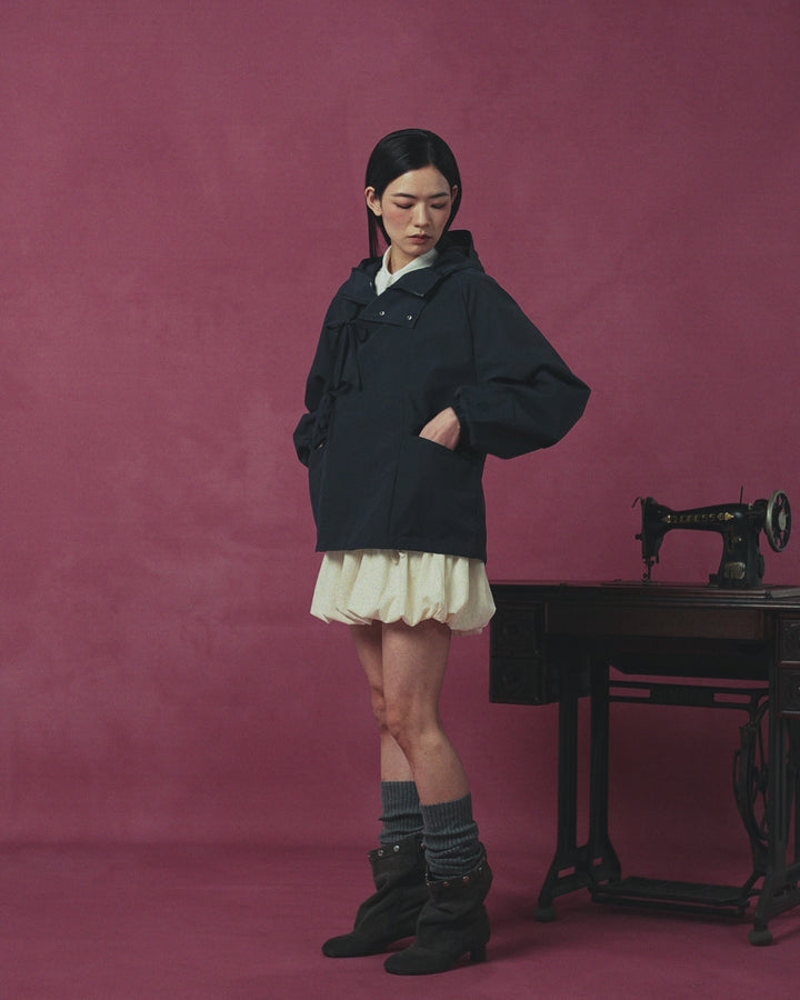 A person wearing the Sundae School NAVY JEOGORI TIE SHELL JACKET, a cream skirt, gray socks, and brown boots stands next to an antique sewing machine against a pink background.