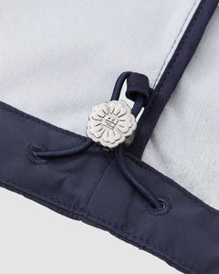 Close-up of the Sundae School NAVY JEOGORI TIE SHELL JACKET: light gray and navy fabric with a dark blue drawstring, finished with a silver flower-shaped stopper. This water-resistant shell is inspired by the traditional Korean jeogori jacket.