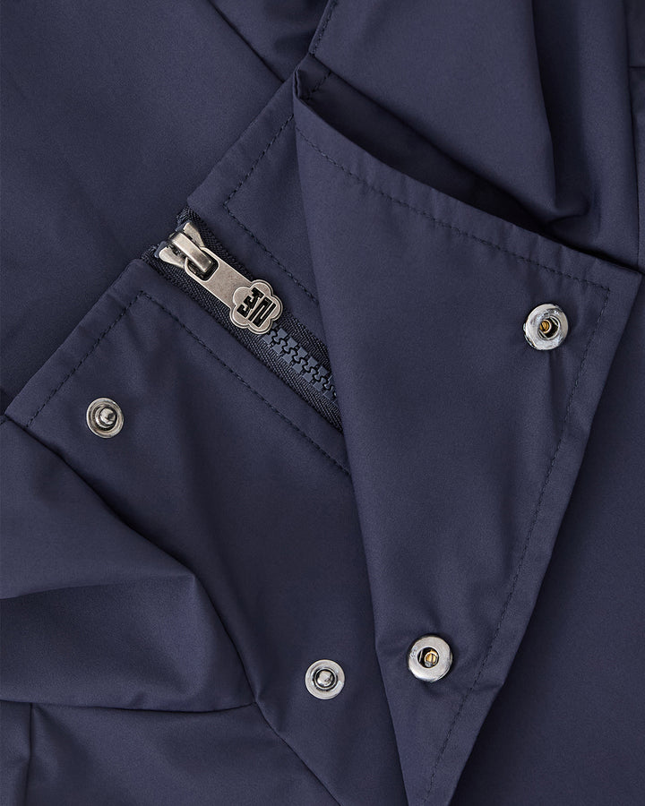 Close-up of the Sundae School NAVY JEOGORI TIE SHELL JACKET, a unisex technical outerwear piece in navy blue with metal snap buttons, a zipper featuring a 3D-engraved pull, and smooth, slightly shiny water-resistant fabric.