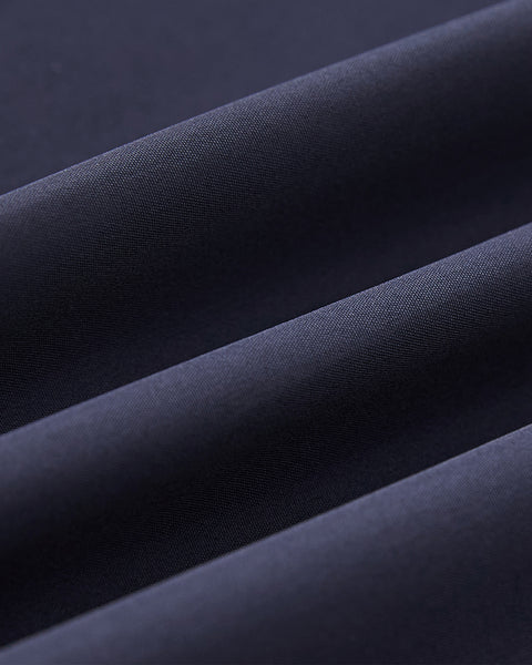 Close-up of the NAVY JEOGORI TIE SHELL JACKET by Sundae School shows folded dark blue, matte fabric. Soft diagonal lines and shadows highlight the fine weave and water-resistant shell of this unisex technical outerwear.